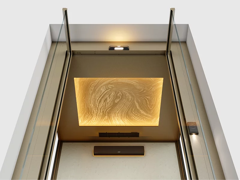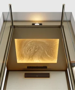 - Lớp trần thứ hai, thường được gọi là “trần giả”. Đây là điểm nhấn trong việc trang trí không gian nội thất của cabin. Lớp trần giả này được thiết kế để mang lại vẻ sang trọng và hiện đại cho thang máy.
